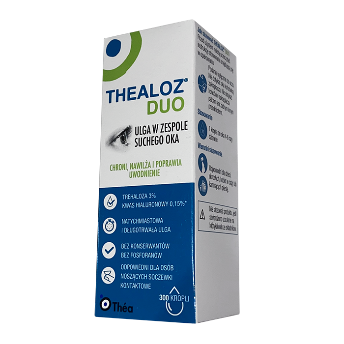 Показания. Теалоз Дуо – это препарат, который используется, когда необходимо увлажнить глаза. Капли Теалоз Дуо также рекомендуются при дискомфорте, жжении и раздражении глаз, которые могут быть вызваны ветром, дымом, загрязнением, пылью, солнечной или морозной погодой, сухим воздухом, кондиционированием воздуха, авиаперелетом или длительной работой на открытом воздухе, просмотром телевизора, вождением автомобиля или другими видами деятельности, требующими длительной зрительной концентрации.