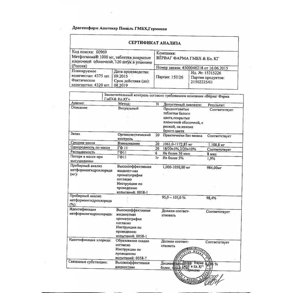 Активное вещество: метформина гидрохлорид 1000 мг;