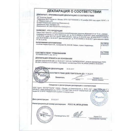 Активное вещество: тамсулозина гидрохлорид 400 мкг.