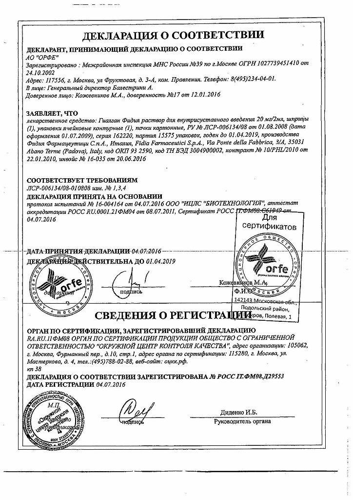 Стимулятор репаративных процессов. Гиалган Фидия представляет собой стерильный, апирогенный, вязкий буферный водный раствор фракции натриевой соли гиалуроновой кислоты высокой степени очистки с молекулярной массой от 500 до 730 кДальтон. Гиалуроновая кислота - необходимый компонент экстрацеллюлярного матрикса, присутствует в высоких концентрациях в составе суставного хряща и синовиальной жидкости. Эндогенная гиалуроновая кислота обеспечивает вязкость и эластичность синовиальной жидкости, а также она необходима для формирования протеогликанов в суставном хряще.