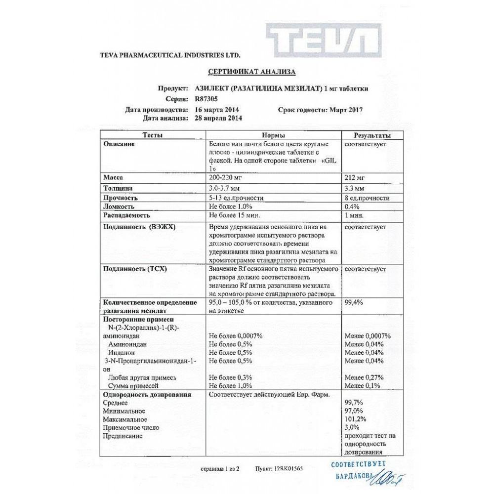 Показания. Купить Азилект следует для монотерапии (без применения леводопы) при идиопатическом паркинсонизме или как адъювантная терапия (с применением леводопы) с колебаниями конечной дозы.