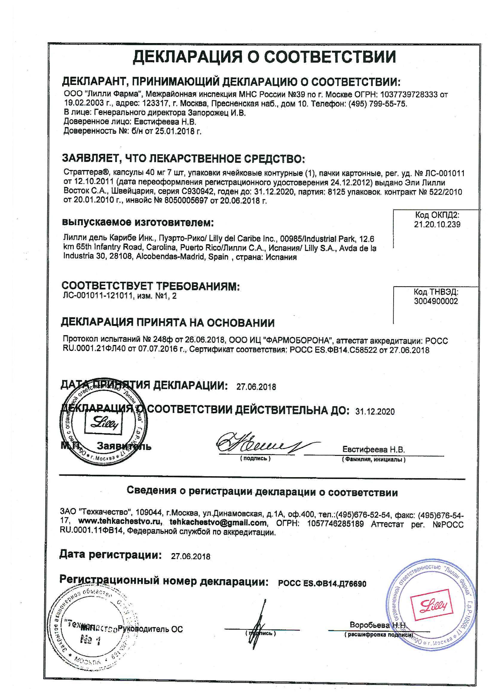 Назначение Страттеры с препаратами, удлиняющими интервал QT (карбонат лития, трициклические антидепрессанты, эритромицин, нейролептики, моксифлоксацин), веществами, изменяющими водно-электролитный баланс, блокаторами CYP2D6 повышает риск желудочковых аритмий.